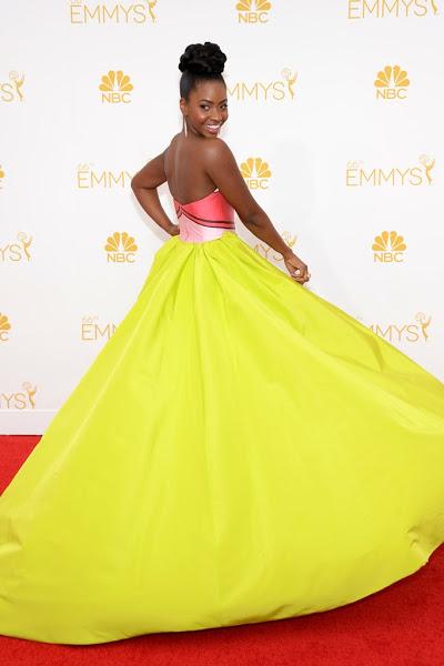Teyonah Parris se atrevió con un vestido en colores neón con cuerpo en tono rosa y falda exagerada de vuelo fluorescente de Christian Siriano que combinó con zapatos de Jerome Rousseau, pendientes de Meira T y anillos de Carrera y Carrera y Suzanne Kelan.