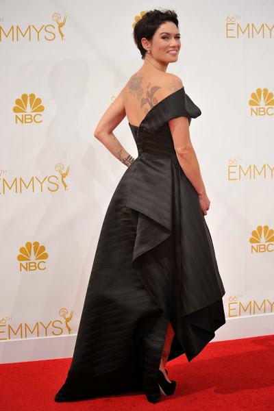 Lizzy Caplan, la "chica mala" reconvertida en "Master of sex", eligió un impresionante vestido con cola y escotazo en la espalda, en clave "black & white" de Donna Karan Atelier.