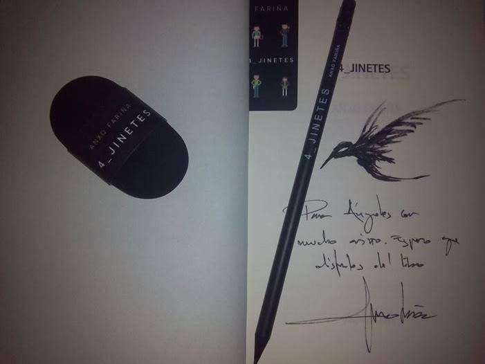 ¿Os suena el libro? ¿Y el autor? efectivamente, ya lo he nombrado anteriormente en mi blog pues le escribí rellenando el formulario de su página web (que podéis leer haciendo click aquí) y como llegué tarde para reseñar uno de sus libros, me envió una cartita negra con marchandising ¡todo un detalle! y ahora hasta tengo mi libro firmado y dibujado por él, que para quien no lo sepa, resulta que es ilustrador, aunque éste libro concretamente no lo ha ilustrado él.
