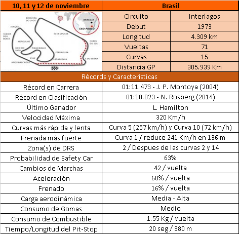 A pesar de que no es el circuito más rápido, muchas de las curvas de Interlagos son medias o altas, y requieren una buena carga en el tren delantero. Esto se compensa con la necesidad de un coche capaz de realizar un buen cambio de dirección a través de la sección lenta de la sección central de la carrera. En ese punto, y en Junção, una buena tracción es vital.