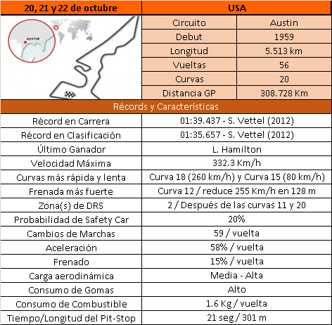 La Fórmula 1 llega a suelo americano otra vez, en esta ocasión el Circuito de las Américas es el encargado en acoger al Gran Circo. Lewis Hamilton llega con 59 puntos de ventaja sobre Sebastian Vettel y es posible que se corone campeón si gana y el alemán no es mejor que 6°.
