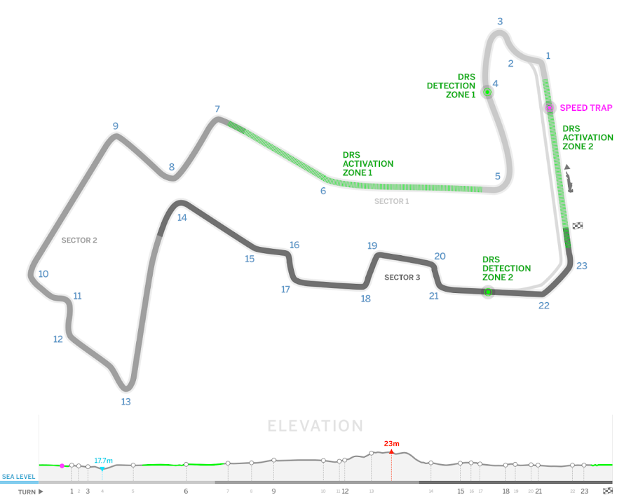 Mapa del Circuito con las zonas de DRS y las elevaciones del mismo.