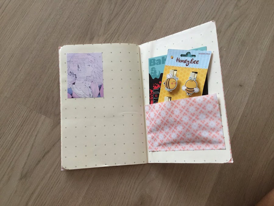 Lo último que hice en cuanto a libretas se refiere fue un detalle para una amiga. Compré una libreta de Sostrene Grene y papel de regalo cuco. Imprimí imágenes que sabía que le iban a gustar y aparte añadí unos clips de abejitas.
