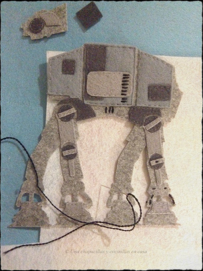 Ya sobre la silueta recortada del at-at, utilicé diferentes tonos de fieltro gris, recortando trozos e hilo de perlé negro para algunos detalles.