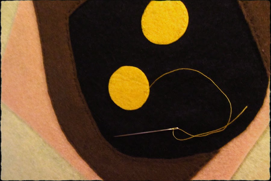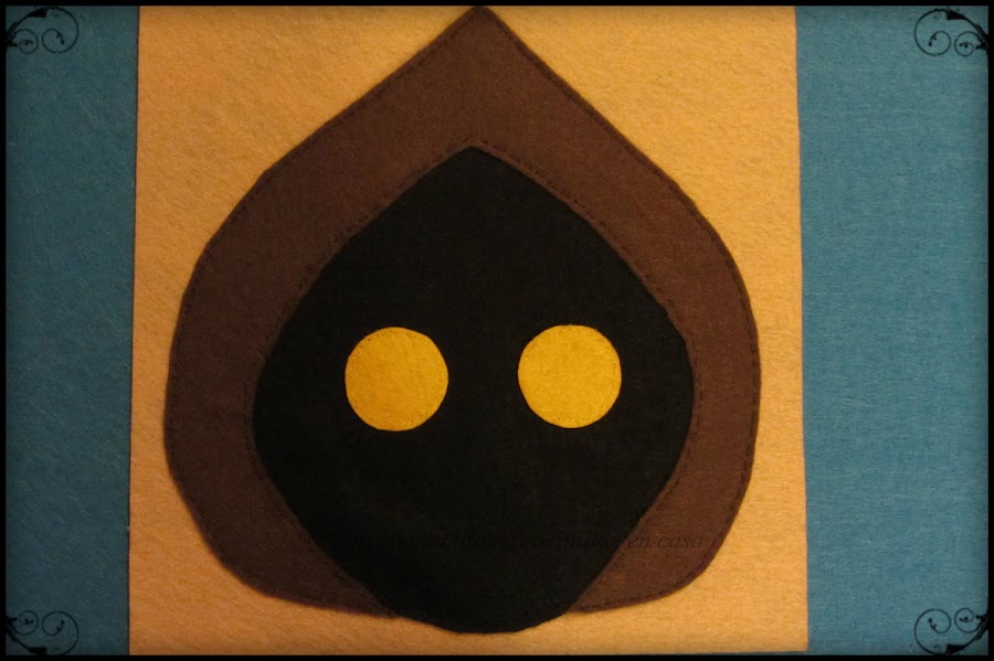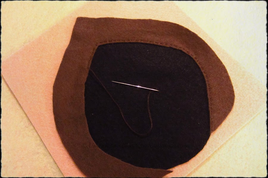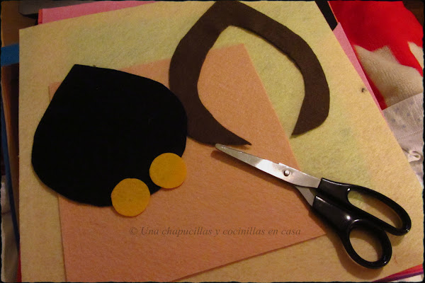 Luego con tres colores, negro, marrón y amarillo ya tendremos listo todo. Recortar la capucha, el interior de la cara en negro ligeramente mas grande que el hueco de la capucha para que se pueda coser bien el marrón por encima y no haya huecos entre ambos, por ultimo dos círculos amarillos para los ojos.