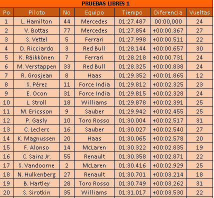 A pesar de su percance, Grosjean fue el mejor del resto en séptimo, aunque a tan solo 1.8 segundos del mejor tiempo por delante del par Force India de Sergio Pérez y Esteban Ocon, octavo y noveno respectivamente, ¡a 2.3 segundos del ritmo de referencia de Hamilton!