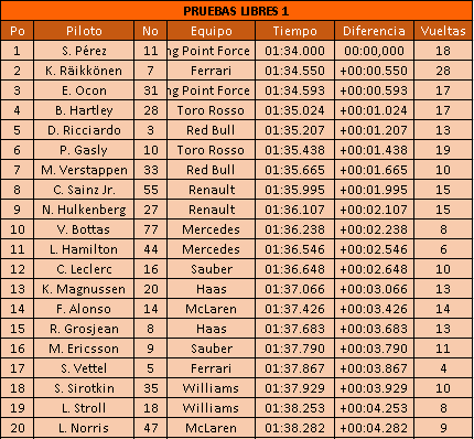 Brendon Hartley de Toro Rosso también tuvo una buena racha de mejorar las condiciones para establecer el cuarto mejor tiempo, un poco más rápido que Daniel Riccardo de Red Bull en quinto, seguido de Pierre Gasly en el otro Toro Rosso y Max Verstappen séptimo en la hermana Red Bull.