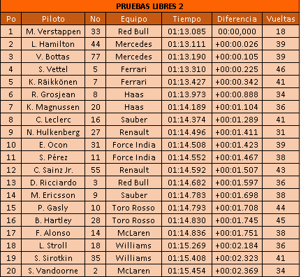 El holandés se recuperó en un mejor tiempo de 1: 13.085 que fue apenas 0.026 mejor que el de Lewis Hamilton en el Mercedes, sin embargo, la sesión de Verstappen fue interrumpida con solo 18 vueltas en sus estadísticas, el Red Bull llegó a un detenerse con una fuga de motor durante una hora en la sesión.