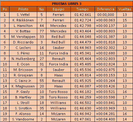 Sebastian Vettel y Ferrari dominaron la parte superior de las pantallas de cronometraje al final de los libres 3, como lo han hecho desde la sesión de apertura del Gran Premio de Bélgica el fin de semana, con Kimi Raikkonen segundo más rápido antes de clasificar para la carrera en el legendario Spa-Francorchamps.