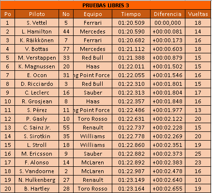La mejor vuelta de Vettel, con 1: 20.509, fue lo suficientemente buena para alcanzar el primer puesto en las pantallas de cronometraje, apenas 0.081 de segundo por encima de Hamilton en el segundo, seguido por Kimi Raikkonen un décimo abajo en el tercer puesto al volante del otro Ferrari.