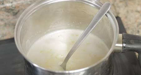 En el cazo añadiremos el azúcar, la leche y la vainilla. Rallaremos un poco de cáscara de limón el cual añadiremos a esa mezcla, y dejaremos calentar ( no hervir)