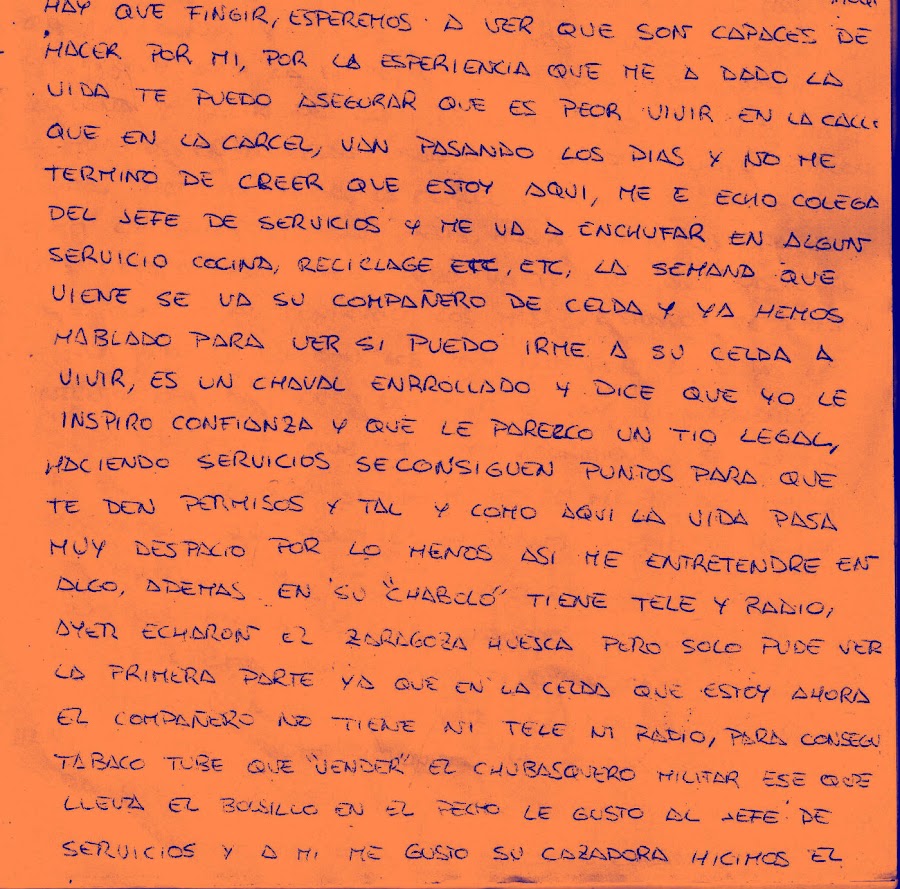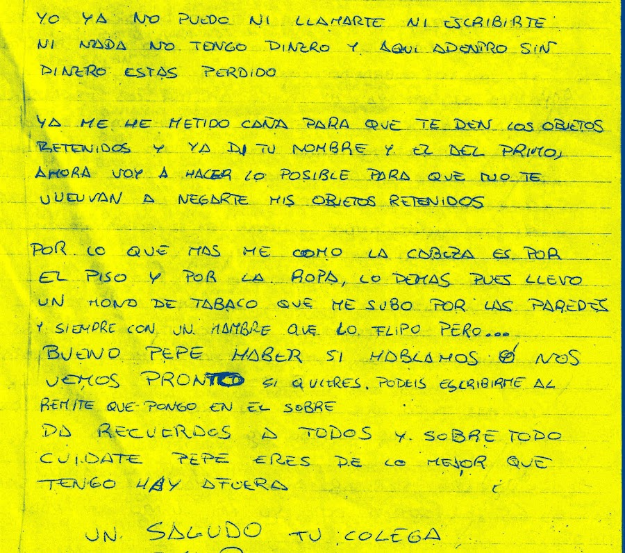 Espero que no te moleste que te escriba, pero es una de las pocas maneras que tengo para evadirme de aquí adentro, y si recibes cartas aquí adentro se te alegra el alma; o sea, que si te aburres y no tienes nada que hacer, coge papel y boli, y caña a la escritura. Tú y al que se le apetezca escribir, ya que lo puede hacer cualquiera, no es como las visitas que eso lo tienen que autorizar. El correo es libre y se supone que secreto, pero... nunca se sabe si lo leen o no lo leen. Da recuerdos a todos de mi parte y cuidaos todos mucho.