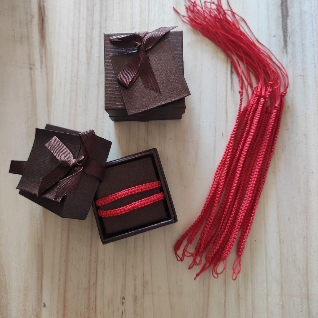 Busca un proveedor que tenga pulseras rojas lisas de hilo. Sin más dificultad y sin gastar absurdos dinerales. No tendrás problema para encontrarlas ya que son las básicas.