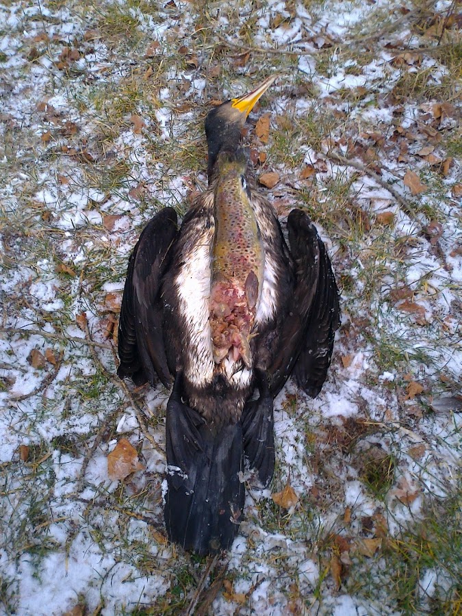 Los cormoranes causan daños gravísimos a la fauna piscícola de nuestros ríos por su voracidad y profusión. Son sumamente agiles en el agua y aprovechan esta facultad para depredar sobre ellos, son de digestión rápida y llegan a consumir quinientos gramos de peces al día, aunque esto puede variar dependiendo de la época y otros factores.
