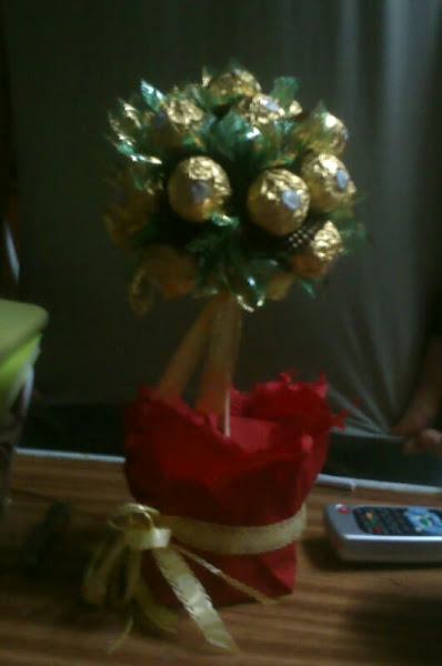 este arbolito de ferrero , me gusto mucho hacerlo y ademas los tres que hice fueron un exito , quedan muy graciosos y los chocolates estan hummmm , que bueno , perdon que la foto esta muy cutre , peo esque el chocolate tiene efectos secundarios , jajajaj