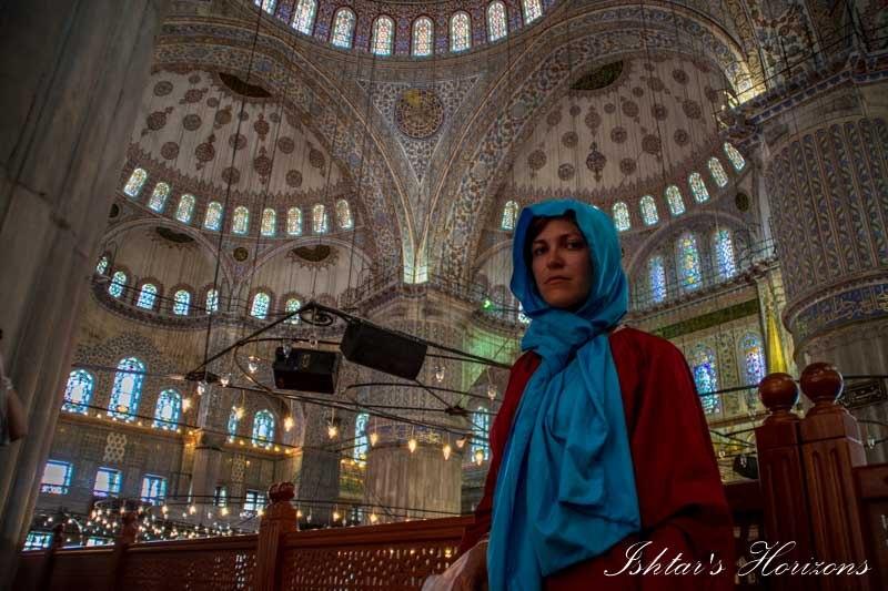 La visitamos a partir de las 14:30 por ser viernes. Me dieron un traje enorme para taparme de pies a cabeza y nos descalzamos a la entrada.