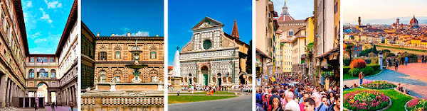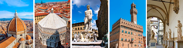 1. Santa Maria del Fiore: el duomo (catedral) es la imagen y el skyline más conocido de la ciudad gracias a su cúpula y el Campanile. Se encuentra en la concurrida Piazza del Duomo, uno de los lugares más visitados de la ciudad y es una obra de arquitectura única en el mundo gótica y renacentista. Hecha de mármol blanco con una impresionante cúpula de más de 100 metros de altura, obra de Brunelleschi, donde también se encuentra su tumba.