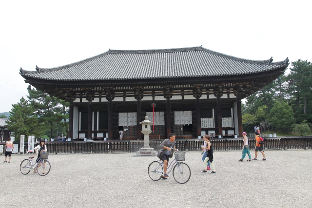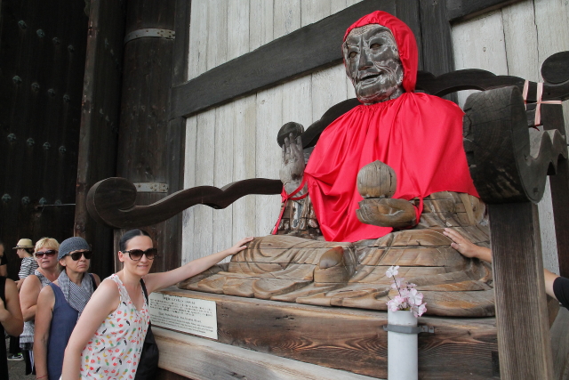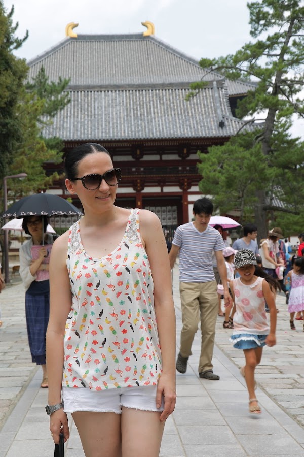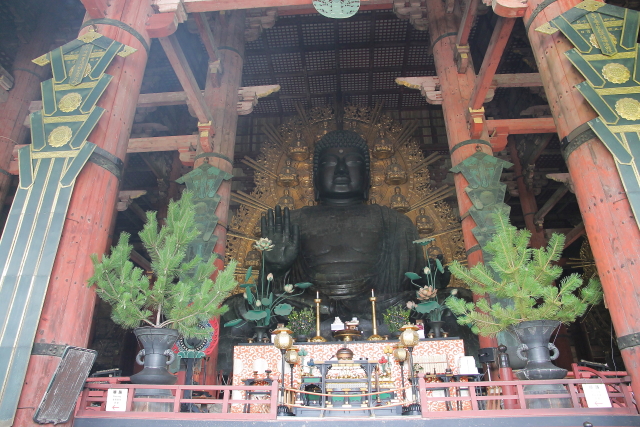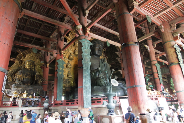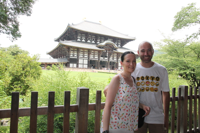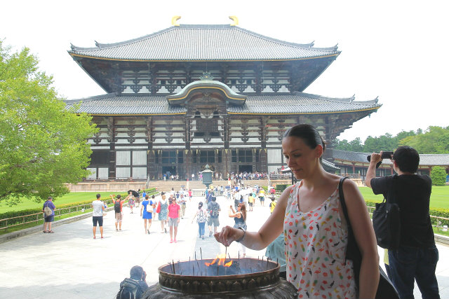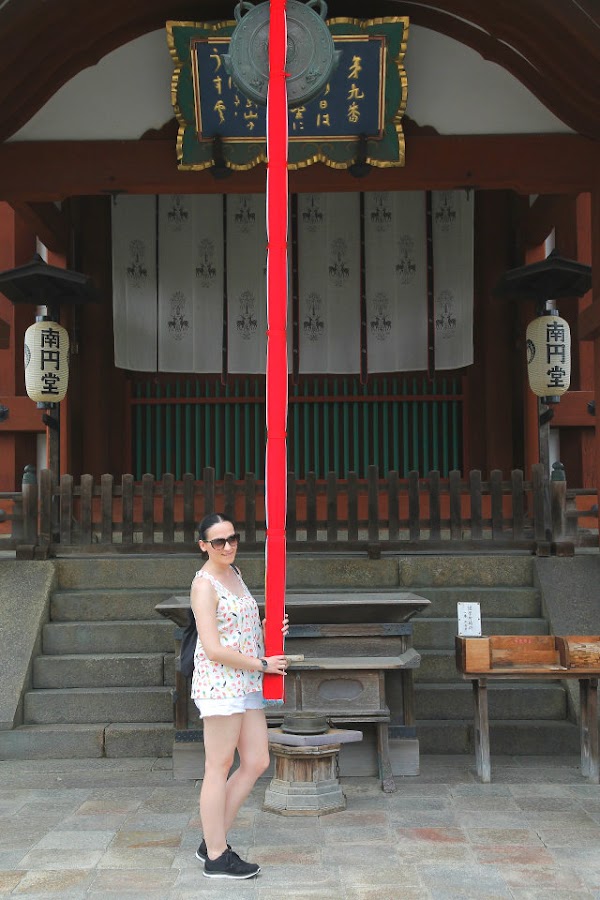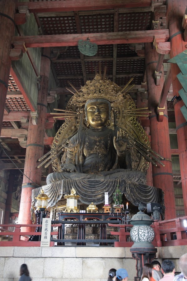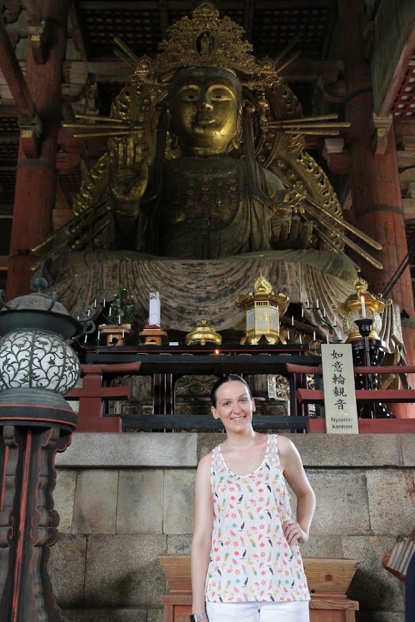 Sin duda, además de Kyoto, Nara para mi fue uno de los sitios más bonitos de Japón. Un lugar mágico lleno de templos a cual más bonito, lastima que prácticamente en todos ellos está prohibido hacer fotografías en su interior porque por adentro aun son más bonitos si cabe. Otra cosa que nos llamó la atención fueron sus pacíficos ciervos repartidos por todos los parques, aunque eso sí, si no les das sus galletas son capaces de comerse hasta los mapas como vimos que a más de uno les pasó. Pero si todos los templos te conquistan con su arquitectura y sus preciosas esculturas, cuando llegas al Templo Todai-ji te quedas sin palabaras al ver al Gran Buda (Daibutsu) en su interior. Sus más de 16 metros lo convierten en el Buda de bronce más grande de Japón. Cuenta la leyenda que el que logre entrar por su nariz y llegue a la cabeza adquiere su sabiduría. Como es imposible trepar por él, una de las columnas del templo tiene un agujero que equivale a uno de los orificios de su nariz para que el que quiera intente atravesarlo y si lo logra reciba la sabiduría de Buda, por supuesto que yo con mi claustrofobia ni lo intenté.
