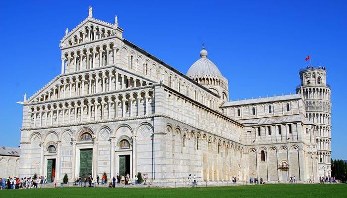 La Catedral de Santa María Assunta es una basílica románica de mármol blanco de cinco columnas. Su construcción inició en 1063 después de la victoria naval de Pisa sobre los sarracenos. Fue consagrada (todavía inacabada) en 1118. Hacia finales de ese siglo se añadió un nuevo frente oeste y se completó el ábside principal. Es un hermoso sitio que ver en Pisa.