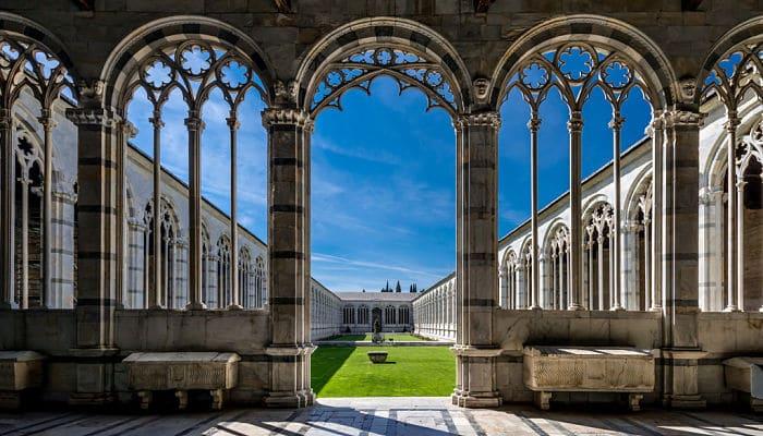 Según la leyenda local, el Arzobispo Ubaldo dei Lanfranchi regresó de la Cuarta Cruzada con varios barcos cargados de tierra del Gólgota. Lo hizo para que los ciudadanos de Pisa pudieran ser enterrados en suelo sagrado. La construcción del Camposanto comenzó en 1278. Es un gran claustro rectangular cuya galería de arcos decorados con tracería gótica abre en el patio.