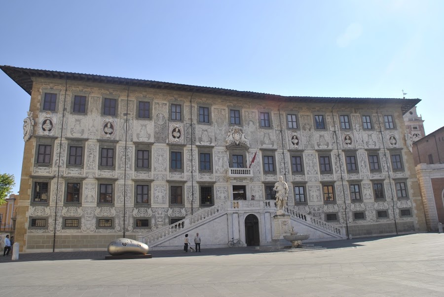 Empezamos con el Palazzo de la Carovana. Está en el mismo centro histórico, muy cerca de la Torre inclinada. Nosotros lo vimos por fuera porque estábamos hambrientos y hacía un calor de mil demonios, así que fuimos directos a buscar un restaurante. Pero antes le tiramos unas cuantas fotos :-) Su fachada nos pareció impresionante.