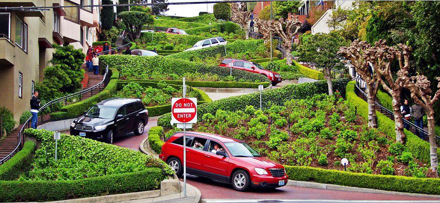Al hablar de San Francisco, una de las características que primero nos viene a la cabeza son sus calles empinadas y sus tranvías, vistas en numerosas películas, series y videojuegos. Lombard Street es la calle más emblemática de San Francisco conocida como la calle más sinuosa del mundo. Esta calle, ubicada en el popular barrio de Russian Hill, cuenta con ocho pronunciadas curvas serpenteantes en una sola cuadra. El diseño paisajístico de la calle, con hermosos jardines y coloridas flores en cada curva, lleva a que sea fotografiada por todos los turistas que viajan a la ciudad.
