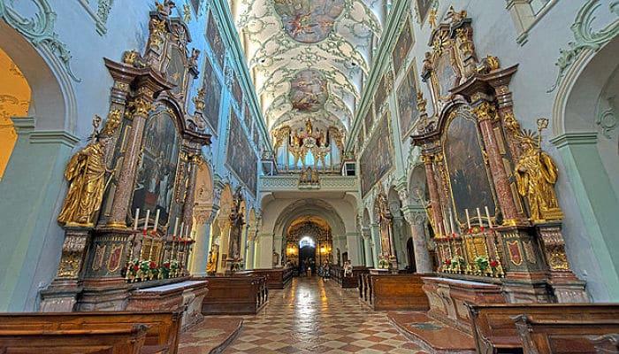 Esta es una de las iglesias más antiguas y bellas de Salzburgo. Fue terminada en 1143, modificada en 1625 y decorada en estilo rococó entre 1757 y 1783. Fue entonces cuando se agregó su distintiva torre. Dentro del pórtico debajo de la torre se encuentra la portada románica del oeste, que data de 1240. Mientras que en el interior todavía puede detectarse el plano original de la basílica románica.