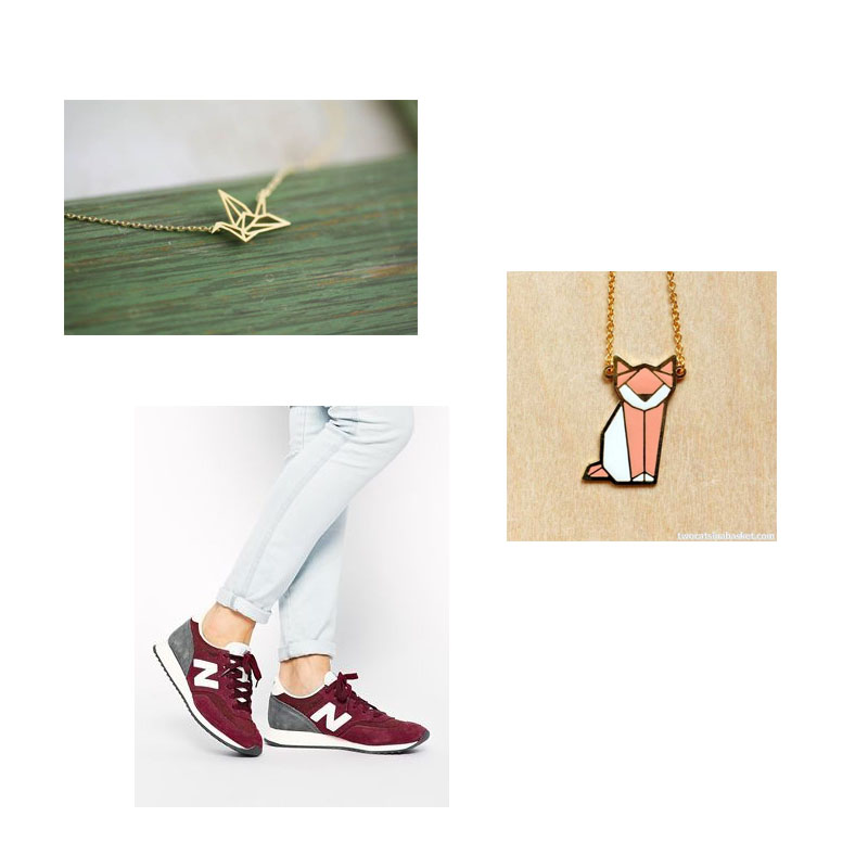Accesorios: Colgante grúa de origami, collar origami cat, New Balance burdeos.