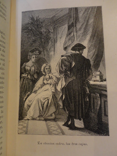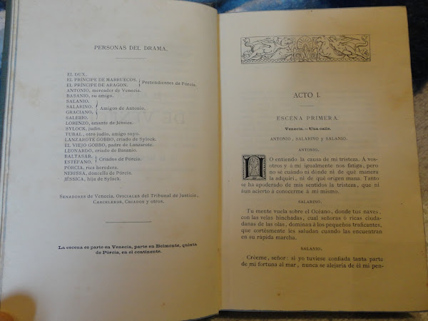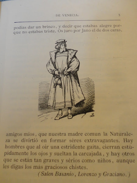 Es una pena, pero no he encontrado demasiados libros antiguos sobre el mercader de Venecia, salvo en recopilatorios de obras de Shakespeare. Como siempre, he tirado de mis ejemplares de la Biblioteca Arte y Letras, donde tengo la obra con unas ilustraciones bastante chulas.