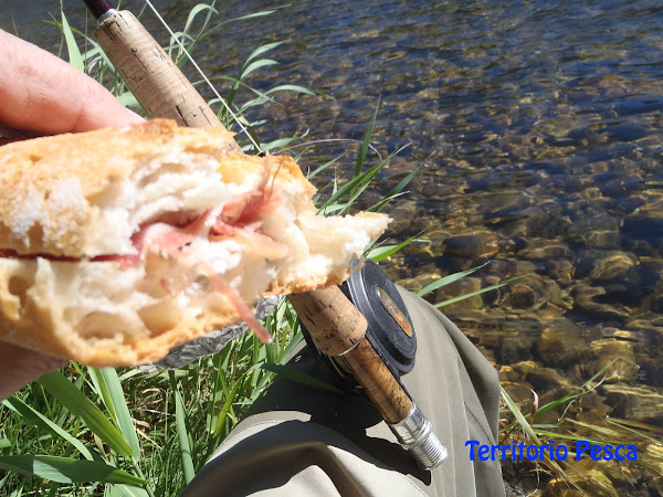 Llegó la hora del bocadillo y a píe de río también lo disfruté. Cuando estaba a medias, allí mismo, a diez metros de distancia se empezaron a cebar dos truchas, tan próximas entre ellas que en un principio creí que era una sola, parecía un capricho, mira que tenían río y río. En un primer momento, cogí la caña y todo, pensando en posar el bocata y darles, pero luego recapacite y preferí observarlas mientras saboreaba un buen jamón, que también puede ser un gran placer.
