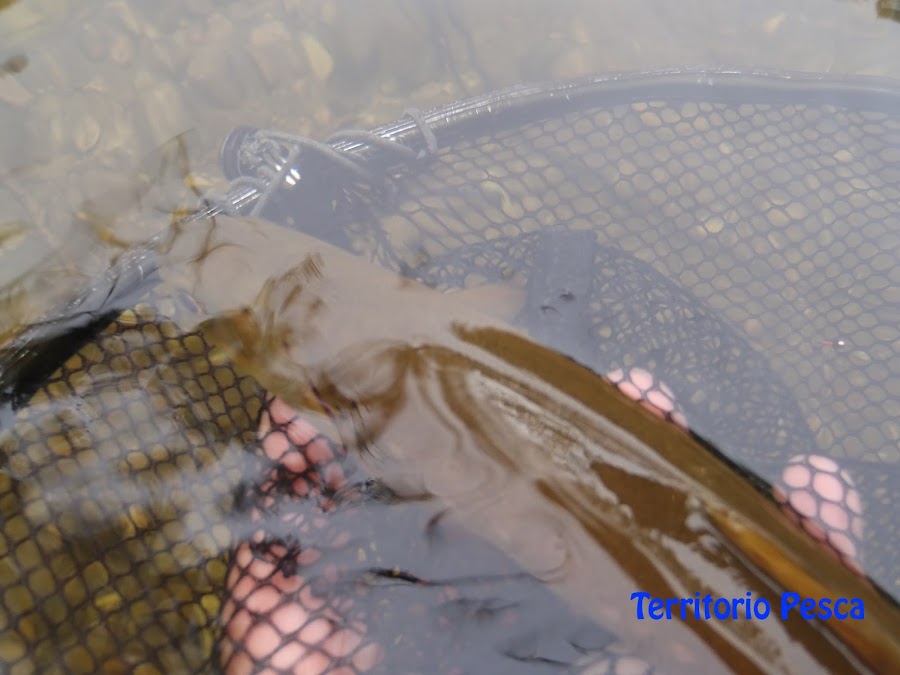 Me aventuré en solitario a una jornada de pesca que comencé con ninfas para acabar pescando a mosca seca. La mañana fresquita no permitía eclosión alguna y así que tuve que buscarlas por entre las piedras del fondo. Pronto me sorprendió una buena picada al finalizar una corriente y conseguí meterla en la sacadera. Río arriba seguí tocando alguna que otra y disfrutando de varias capturas más.