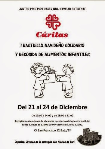 Concretamente, en la parroquia de San Nicolás de Bari de Avilés, se está organizando un rastrillo solidario muy especial; es especial porque la iniciativa proviene de gente muy joven (con edades comprendidas entre los 16 y los 18 años); es especial porque estos chavales tienen una motivación increíble y enormes ganas de ayudar; es especial porque están consiguiendo colaboraciones buenísimas por parte de las empresas a las que les han solicitado ayuda (Alimerka, Asociación de Reposteros y Confiteros de Asturias, Restaurante El Balcón, Real Avilés Industrial, Casa Tataguyo, Syrah, Trasluz, Deportes Pardo, Opium, Tino Boutique...); es especial porque van a contar con gran variedad de productos (desde decoración navideña hecha a mano, hasta dulces caseros, pasando por bisutería, ropa... y, cómo no, sorteos de cestas de navidad?); pero, sobre todo, es especial por el doble objetivo que pretenden conseguir mediante el mismo: por un lado, colaborar con la Cáritas Parroquial de San Nicolás de Bari de Avilés y por otro, ayudar a la Casa de Acogida para madres de La Guía de Gijón.