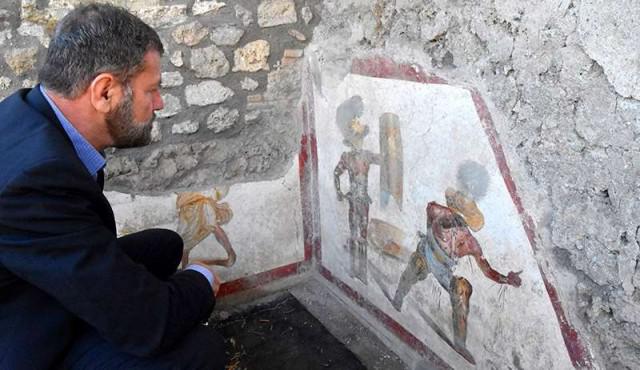 Lo que es particularmente interesante es la representación extremadamente realista de las heridas. Como la de la muñeca y el pecho del gladiador fracasado, de donde sale la sangre. Mjando sus calzas, dijo Osanna. El Thraex está gesticulando con la mano, posiblemente pidiendo piedad, dijo. El fresco, que mide 1,12 metros por 1,5 metros. Se encontró en lo que los excavadores creen que era una habitación en el sótano, ya que la huella de una escalera de madera se puede ver por encima.Tesoros de una ciudad en ruinas