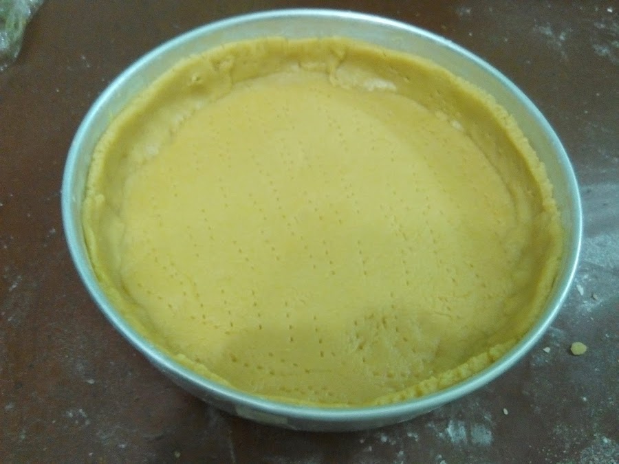 Tomo la masa y la coloco en el embace previamente engrasado con mantequilla y harina (yo como no tenía embace de tartaleta que es que se usa para que tome la forma, use uno normal pequeño de torta), lo sé es terriblemente delicada y se suele partir al levantarla, trata de llevarla como puedas al embace y una vez allí puedes acomodarla mejor con la yema de tus dedos, ya teniendo la base de pie lista coloco tiras de la misma masa estirada en los borde del embace para formar una especie de canasta, únela con tus dedos a la base para que no haya huecos por donde se escape el contenido.