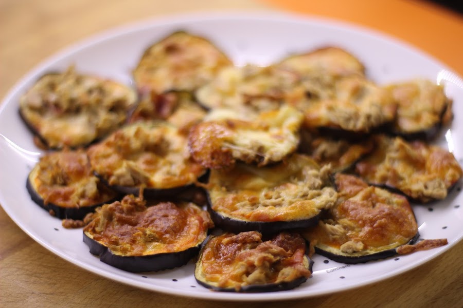 Para hacerlas utilizo una berenejena, mozzarella, dos latas de atún y tomate natural triturado (para dos personas). Y es tan fácil como cortarlas berenjenas en rodajas (yo las corto muy finas para que queden más crujientes), poner una cucharada de tomate en cada rodaja, un puñadito de queso y otro poco de atún; así hasta terminar con todas las rodajas. Se pone en una bandeja de horno cubierta con papel vegetal y se meten al horno a 200º unos 15-20 minutos. Yo pongo calor abajo y ventilador para que queden bien crujientes. Con tomate natural triturado a veces quedan un poco blandas, así que cuando tengo en casa tomate concentrado lo prefiero al natural.
