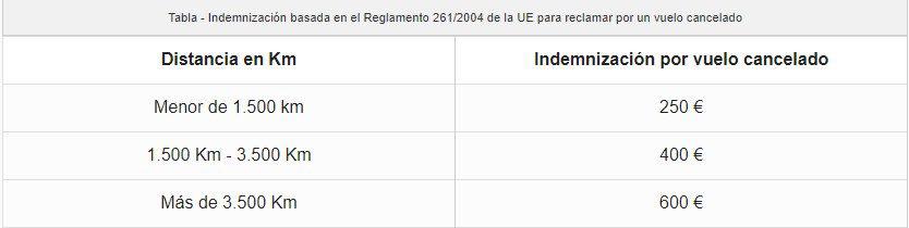 La indemnización por cancelación, retraso u overbooking en un vuelo, según el Reglamento 261/2004 de la Unión Europea depende de la distancia en kilómetros del recorrido, partiendo desde los 250€ en vuelos de menos de 1.500 kilómetros, 400€ en los vuelos de 1.500 a 3.500 kilómetros, y, alcanzando los 600€ en los vuelos de más de 3.500 kilómetros.Asimismo, esta no es la única compensación de la que dispone el pasajero, ya que, además de esta compensación económica, el usuario tiene derecho a una reubicación para llegar a su destino final, pudiendo aceptarla o no. En el caso de aceptarla, la compañía aérea deberá hacerse cargo de los diferentes gastos que tenga el usuario a nivel de hospedaje, transportes alternativos, comida y similares hasta llegar a su destino. Además, en el caso de no aceptar esta solución, el usuario tendrá derecho al reembolso total del billete, y, al coste total de un nuevo billete usado para el mismo propósito de viaje.