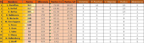 El domingo Hamilton no pudo derrotar a su compañero de equipo, Bottas, este último se alzó con su 3era victoria en la F1 y la 76 para el equipo Mercedes, además, el propulsor teutón ya cuenta con 162 GP ganados. Asimismo, la escuderia campeona alcanzó el doblete n° 40 de todo su historial. En lo que respecta a los podios, Hamilton sigue ampliando sus números, ahora tiene 117 y solo se encuentra 38 del n° 1, M. Schumacher.