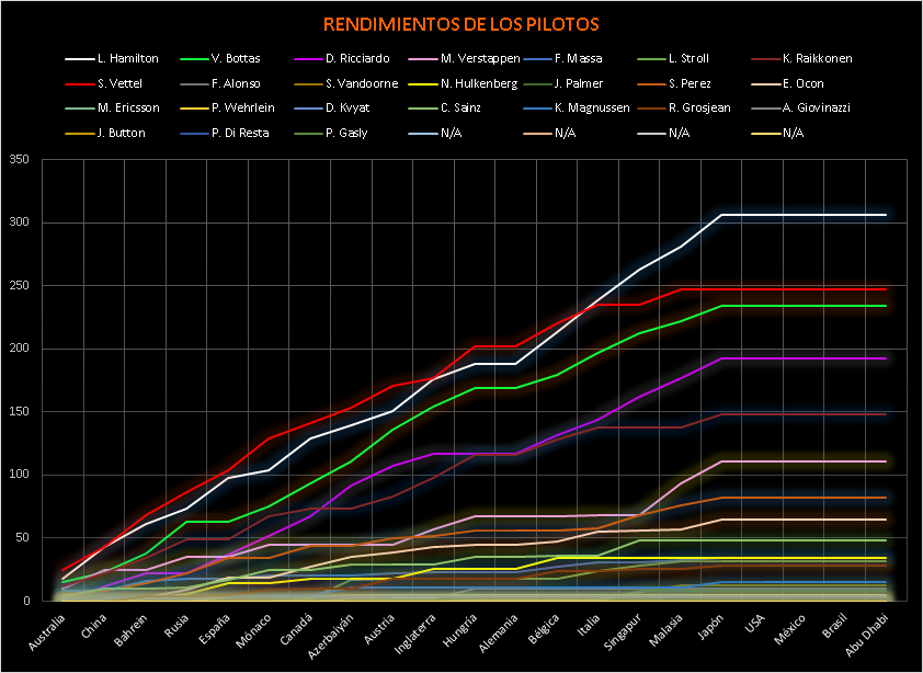 Respecto a los puntos, Hamilton ya supera a Vettel por casi 200, el inglés ha acumulado 2553 puntos hasta ahora (desde su debut en 2007), mientras que el alemán 2355 desde el mismo año. Fernando Alonso, con un poco competitivo McLaren, no pudo sumar puntos en Suzuka, pero se mantiene 3° con 1842, a años luz de los dos primeros.