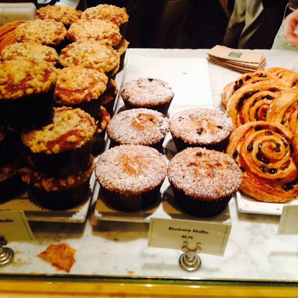 Unos macarons tamaño gigante, yo compré unos de tamaño regular en una cajita de seis muy linda. Por supuesto que también tenían eclairs (por cierto me arrepiento de no haber comprado uno, se miraban preciosos), cupcakes y más abajo si alcanzan a ver es yogur con granola, también tienen como desayuno un "croissant and a coffee special" por $10.95 dlls.