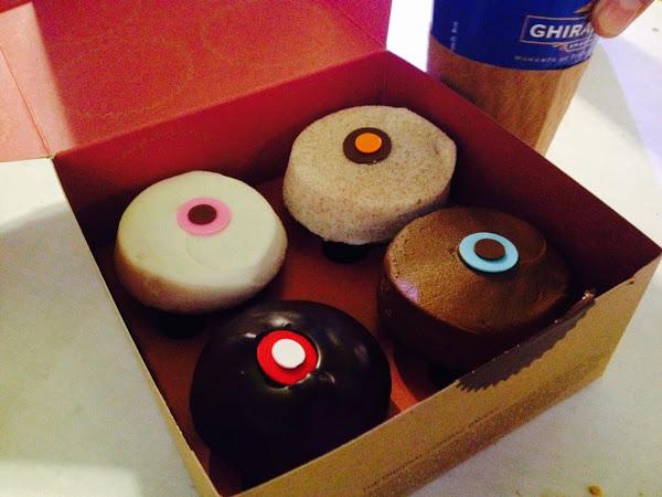 En la cajita están un vanilla cupcake, cinnamon sugar, chocolate marshmallow y dark chocolate. Al igual que los macarons la caja de cupcakes con 4 costó $15.00 dlls. $3.75 dlls. cada uno. Ordené 4 por que miré el precio por los cuatro y pensé que eran más baratos así, además de que quería probar varios sabores. Luego me di cuenta que era lo mismo. Fue muy gracioso eso. Quedaba rodando uno, nosotros somos tres, al menos si hubieran sido 6, dos para cada quien, pero así 1 1/3.