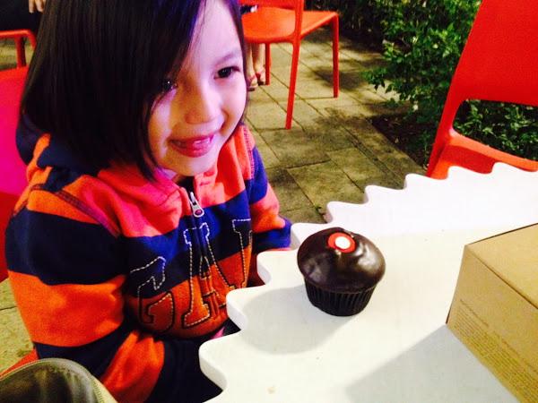 Mi pequeñín a punto de comer "su cupcake", claro que a él de chocolate. Su favorito. (Entre comillas "su cupcake" por que le quitamos un poco mi esposo y yo). Al final entre todos probamos y comimos de todo. Saúl nada más los de chocolate.