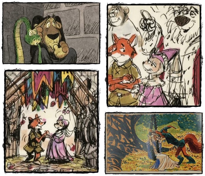 Imagino que todos conocemos de que trata este cuento: Un bandolero que roba a los ricos para ayudar a los pobres, pero lo cierto es que esta película de Disney paso muy pero que muy desapercibida, quizás por su temática medieval que no atrae a todos ni llama la atención de los niños (en general) o porque los personajes sean animalicos y no personas...Tengo amigas que me dicen que es de las mas aburridas de Disney pero a mi siempre me gusto, tenia sus escenas románticas con Lady Marian y Robin, las de risa con Little John y Lady Kluck e incluso escenas tristes, como cuando aparece la cárcel con todos los que no pueden pagar y esa escena en la que un ratoncito muerto de hambre recoge una migaja de pan y se la reparte a los demás :"(