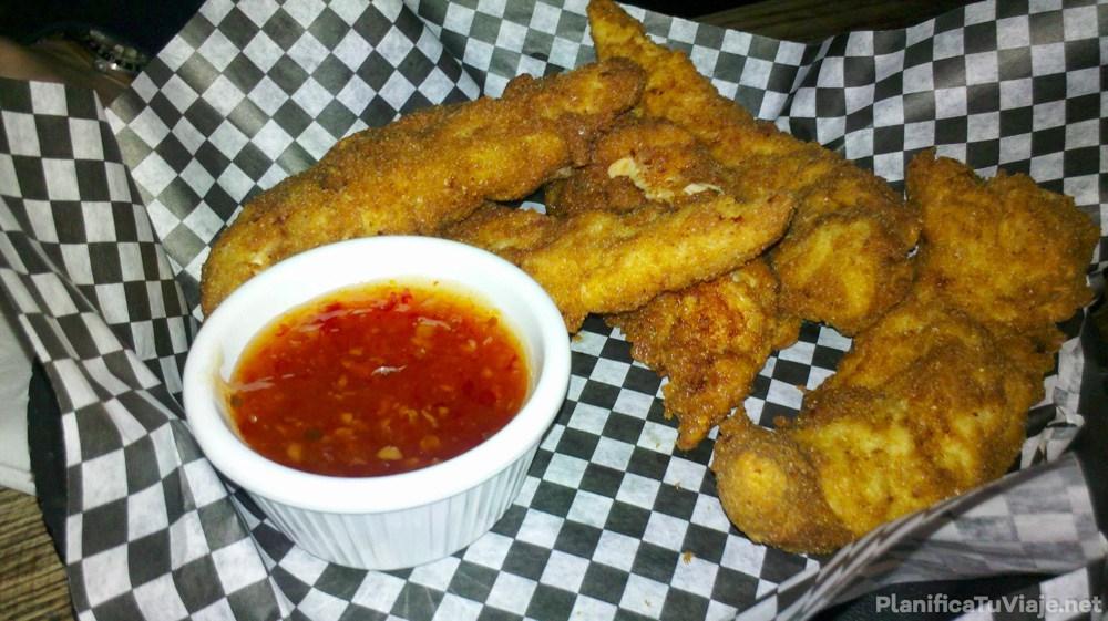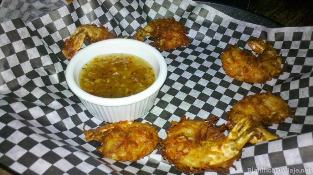 Un señor grandote de seguridad custodiaba el ingreso, bien de gordos preguntamos si la cocina seguía abierta y nos respondió con la palabra más linda que escuchamos en el día: “yes”. Nos pidió los documentos y entramos a Sissy’s K. Encontramos una mesita, pedimos unos langostinos rebozados y unos pinchos de pollo (light por supuesto!) para comer y obvio unas cervecitas para acompañar.