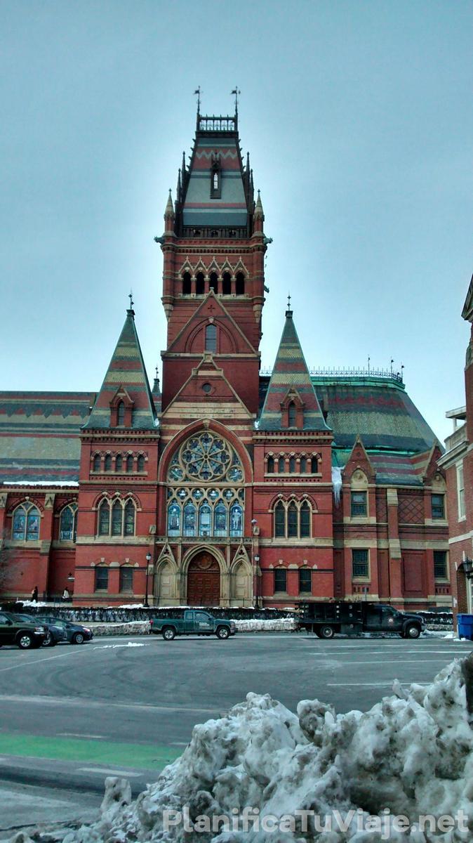 Ya cargados de suerte seguimos recorriendo los edificios, siempre por fuera, no habíamos investigado en qué edificios se podía ingresar y en cuales no, y veníamos en modo visita relámpago sin mucho tiempo extra. De repente nos encontramos con este edificio que nos encantó, la foto solo muestra una parte del mismo, pero es enorme. Más tarde descubrimos que era el Memorial Hall de Harvard y que por dentro era tan bello como por fuera, otra excusa para volver en otro momento y conocerlo con más tiempo.