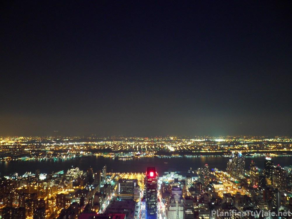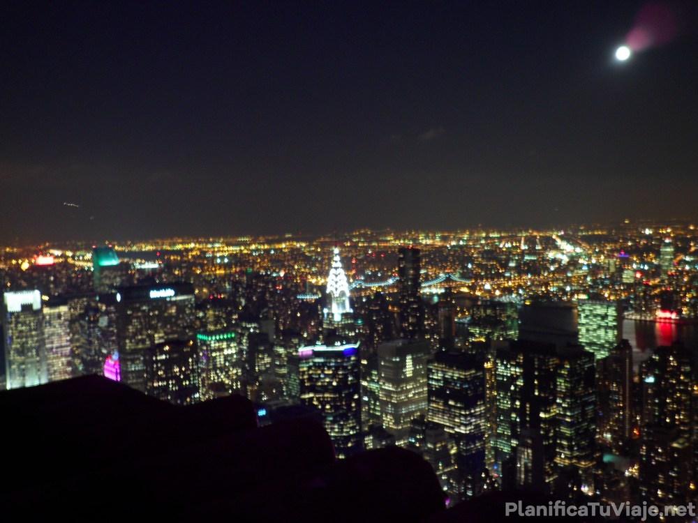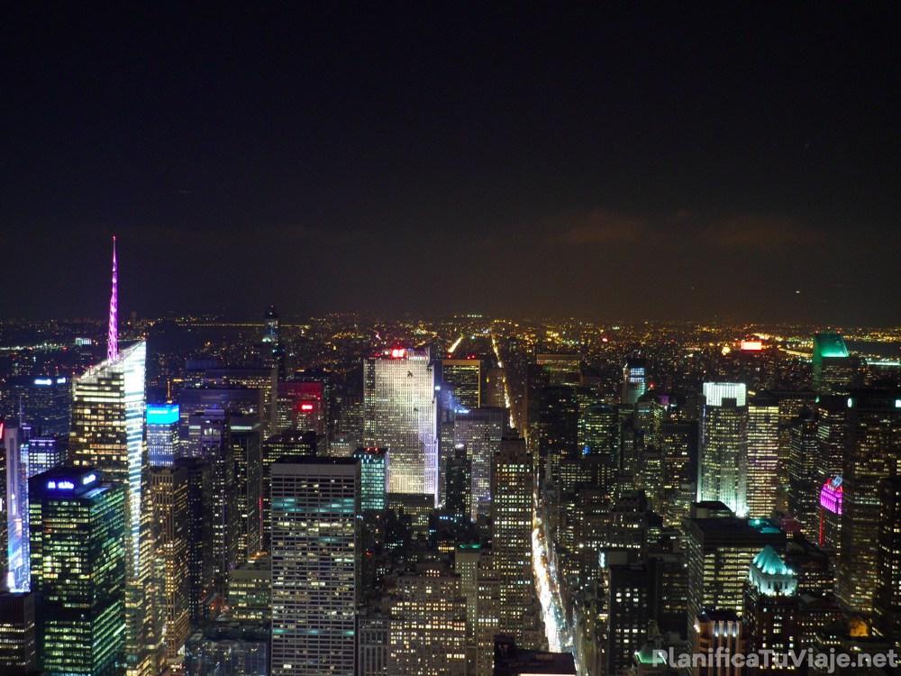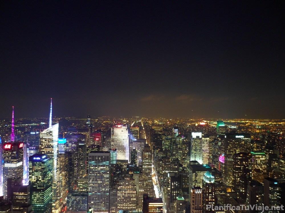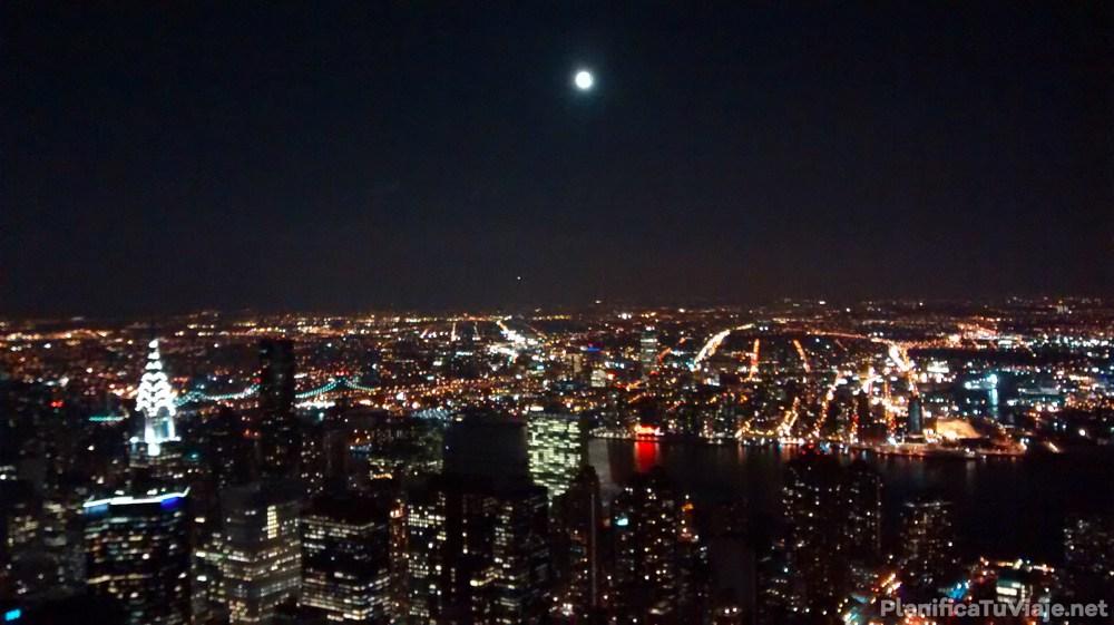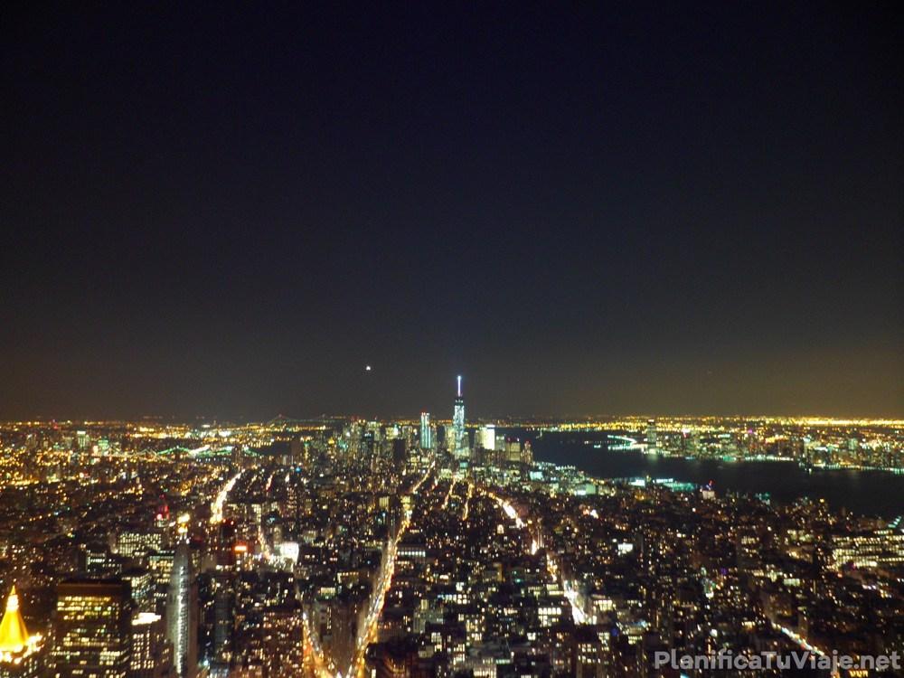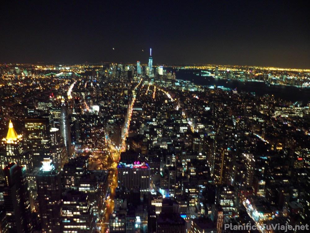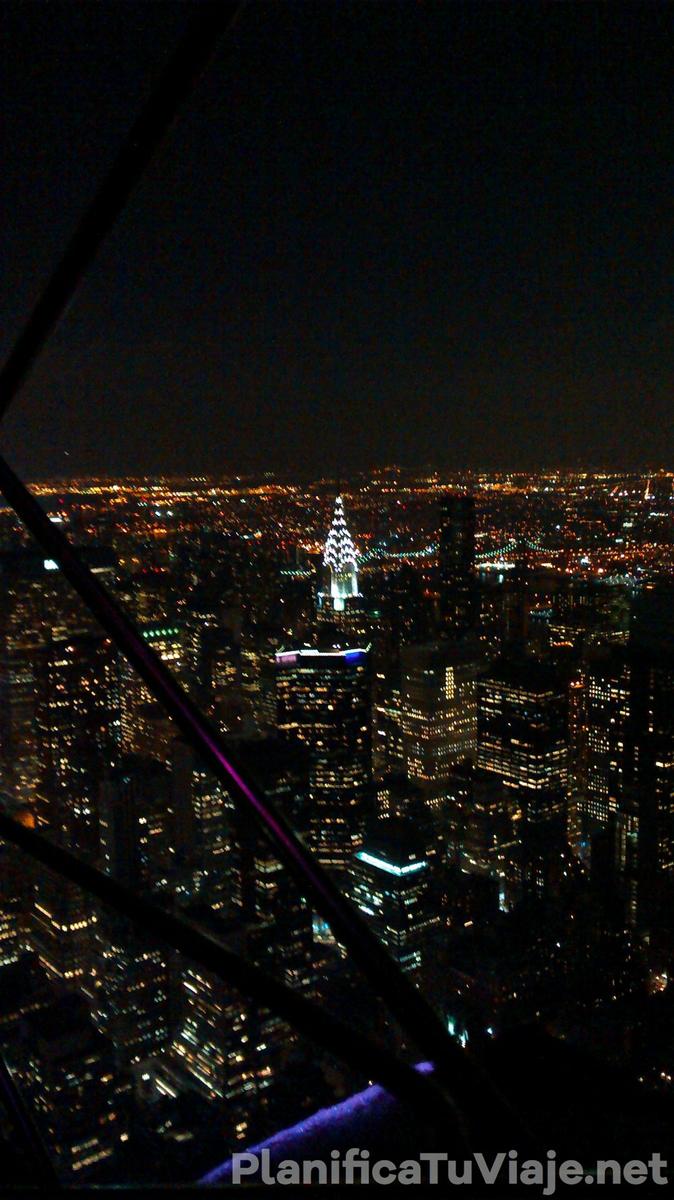 El Empire State tiene una vista 360º y la verdad que ver iluminada la ciudad es algo hermoso. El viento nos estaba matando, hacía tanto frío que veíamos como se creaba la escarcha en los vidrios que rodean el mirador. Sacamos algunas fotos, salieron bastante malas porque estábamos temblando de frío y porque sacarse los guantes para sacar una foto era bastante tortuoso.