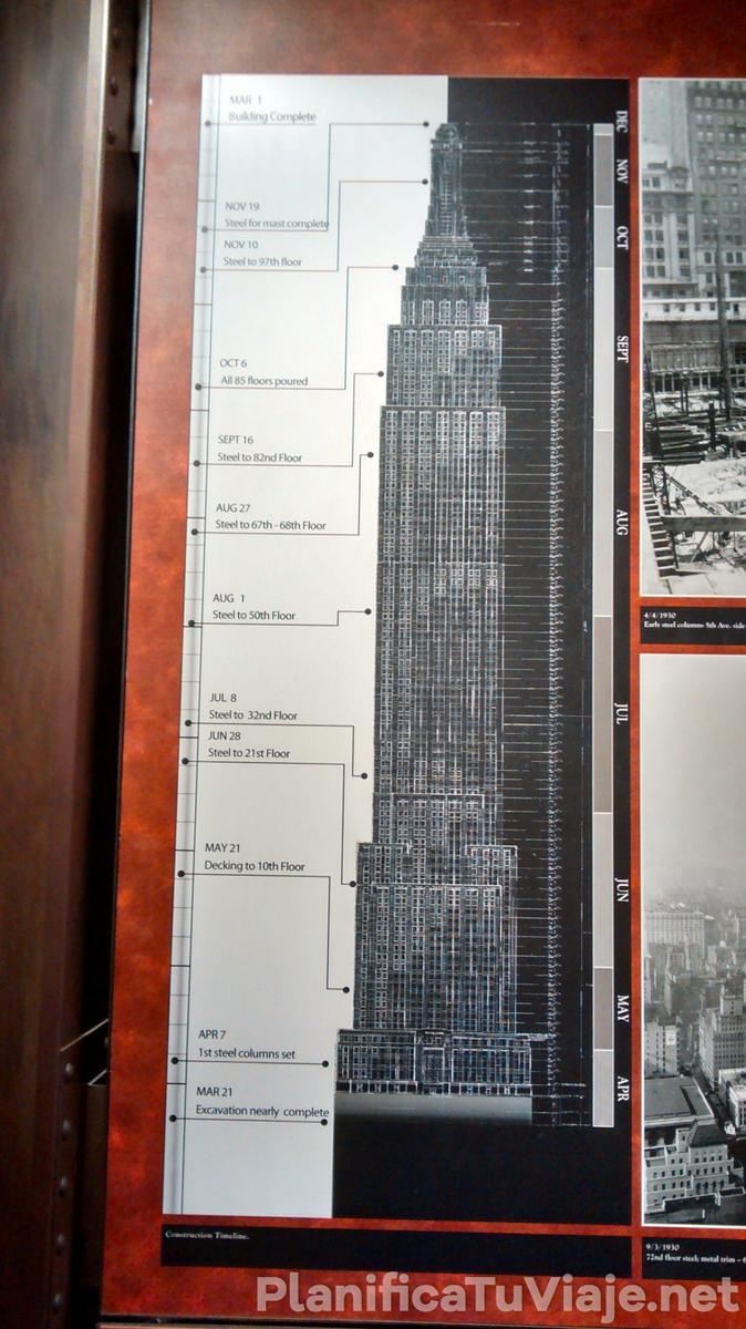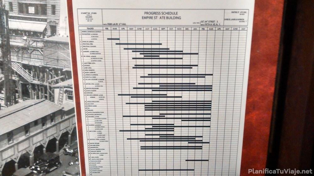 Antes de subir hay una exposición que te muestra como se fue construyendo, los plazos para cada parte, un diagrama de Gantt con los tiempos planificados y un montón de datos más sobre la construcción del rascacielos. Está muy bueno, al menos para nosotros que somos ñoños, ver los documentos con el detalle de cantidad de empleados haciendo cada cosa, los materiales que usaban y los tiempos planificados.