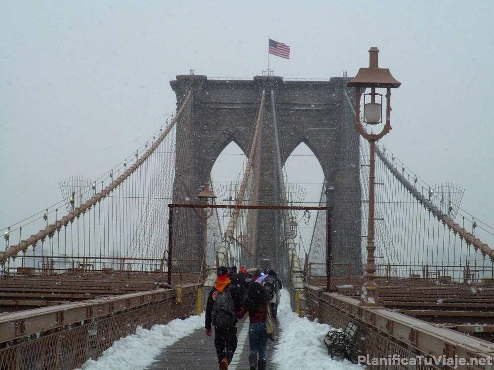 Bajamos en la estación City Hall, rodeamos la manzana donde se encuentra el New York City Hall y empezamos la caminata hacia el Puente de Brooklyn. Nevaba bastante y había mucho viento, sin embargo vimos muchísima gente con ropa de running corriendo en el puente. No se que tan térmicos eran esos buzos finitos, pero nosotros estábamos abrigados con mil capas de ropa y no entendíamos como no se congelaban. Con un clima así un sábado a la mañana yo me quedaría tomando mate en la cama, no se me ocurriría jamás salir a correr.
