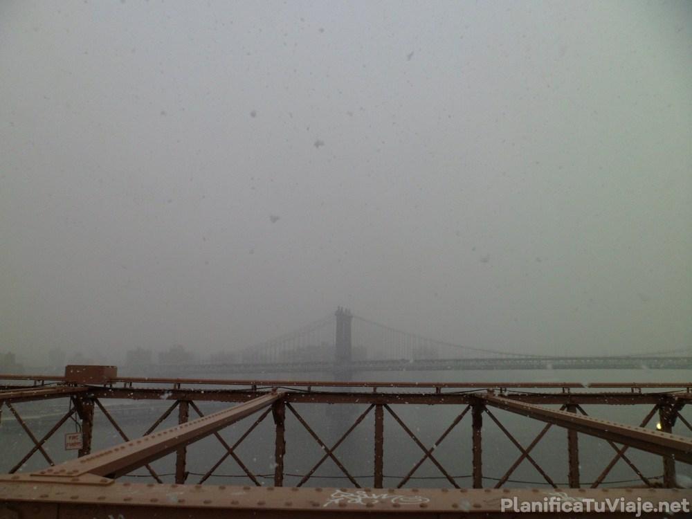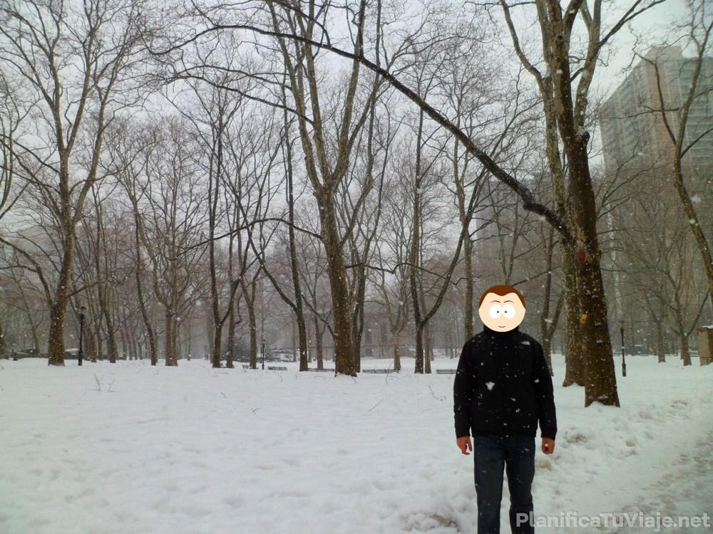 Llegamos al otro lado y todo estaba blanco. Había mucha nieve acumulada en las calles y casi no había gente caminando. La nevada fuerte había calmado por suerte, así que decidimos ir al parque Brooklyn Heights Promenade a sacar algunas fotos de Manhattan. Caminamos un par de cuadras y nuevamente la nevada fuerte con viento y la visibilidad reducida. No se veía de donde estábamos a 2 cuadras, claramente las vistas de Manhattan no iban a estar buenas.