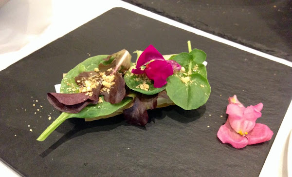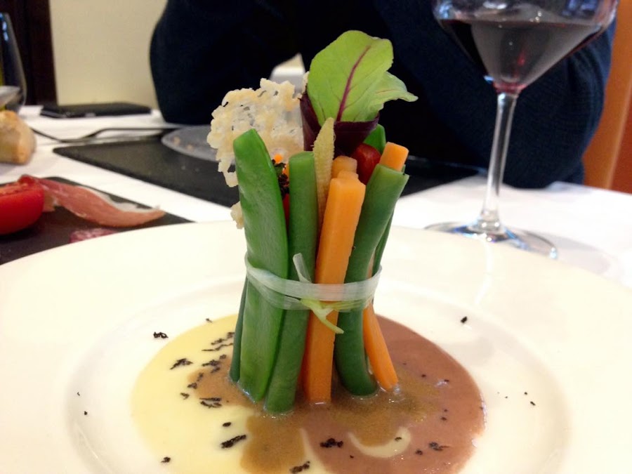 El siguiente entrante os lo mostré hace poco en redes sociales para ir abriendo boca: verduras de temporada en equilibrio, tapanade de ging negro, gang verde, vinagreta trufada y crujiente de parmesano. Las verduras estaban crujientes, no hervidas. Fue un plato muy diferente a lo que estoy acostumbrada a probar.