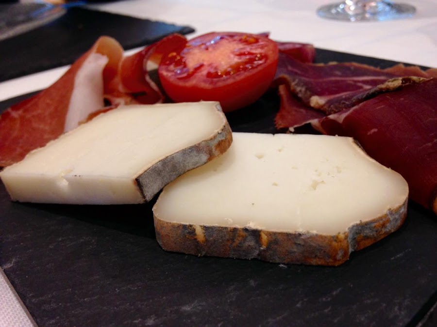 Seguidamente un aperitivo tan sencillo como espectacular: queso, jamón, cecina y longaniza de Aragón con tomate de colgar sobre un plato de pizarra de los que tanto me gustan.